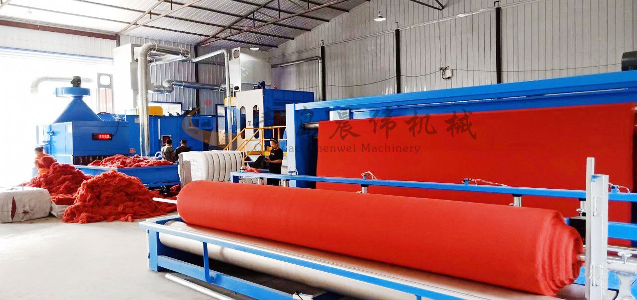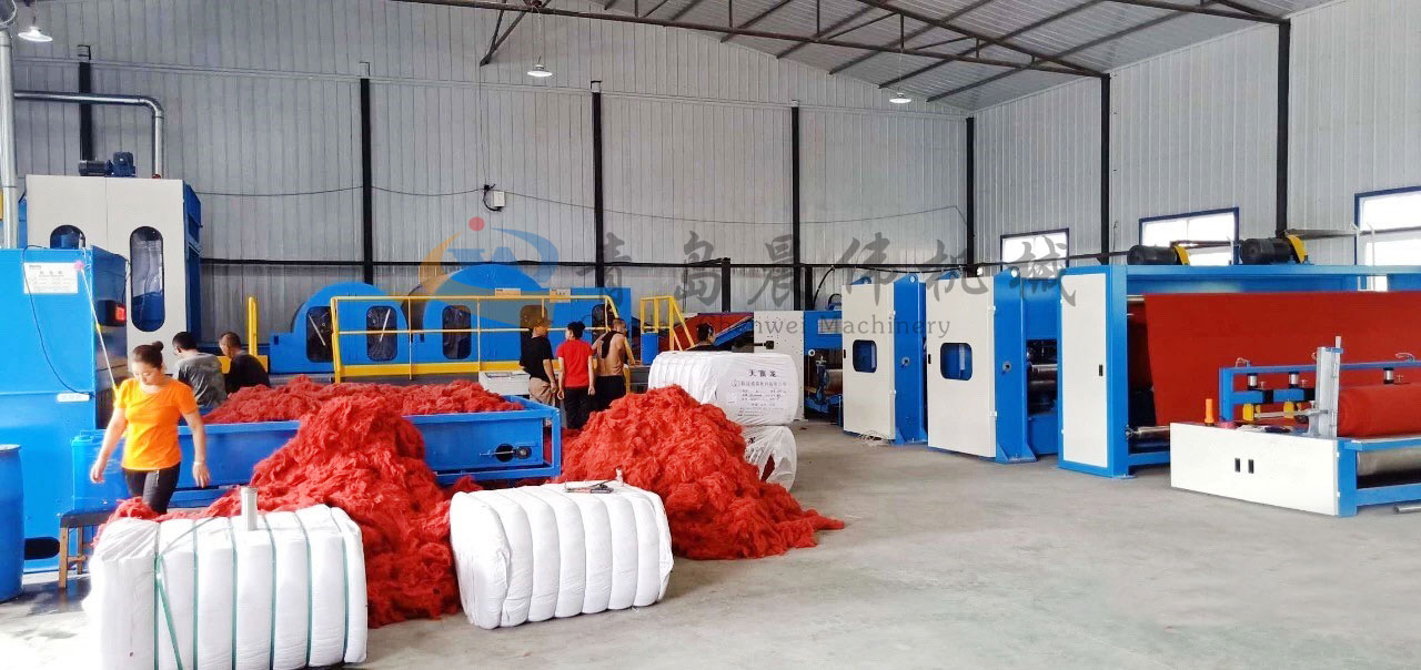 開(kāi)包機(jī)-開(kāi)松機(jī)-振動(dòng)給棉機(jī)-梳理機(jī)-鋪網(wǎng)機(jī)-針刺機(jī)-切邊成卷機(jī)