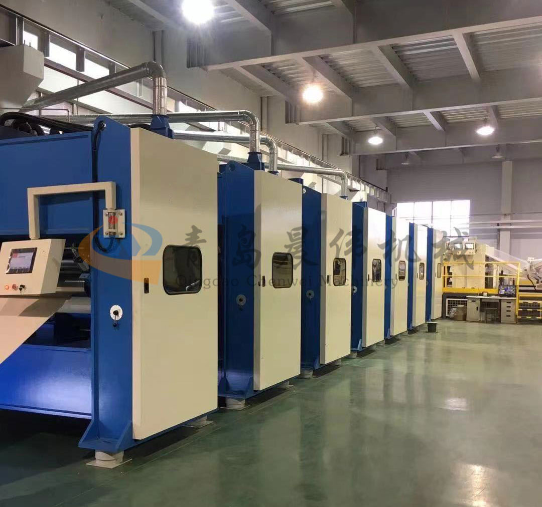 7. CWCQ-切邊成卷機:設(shè)備配置3-5把切刀,可根據(jù)不同產(chǎn)品的尺寸要求將產(chǎn)品切成不同的規(guī)格長度,方便靈活。采用變頻器控制調(diào)速當(dāng)棉層達到一定的規(guī)格長度時,數(shù)碼記數(shù)收卷,切刀自動切斷。收卷輥由收卷電機驅(qū)動,收卷速度的控制系統(tǒng)與拉伸機的驅(qū)動系統(tǒng)聯(lián)網(wǎng),與拉伸機同步,受張力控制器的反饋控制。展開輥使棉層展平,消除棉層在拉伸應(yīng)力作用下產(chǎn)生的一些縱向皺紋。