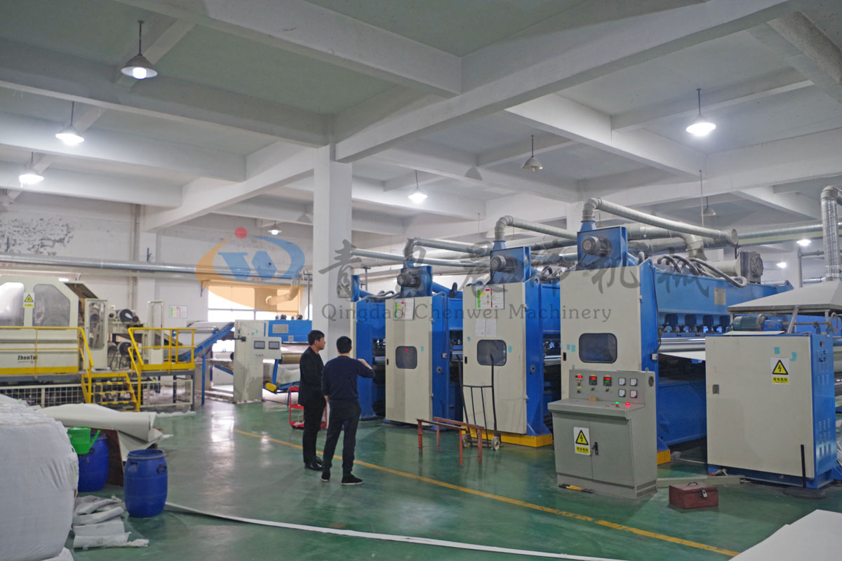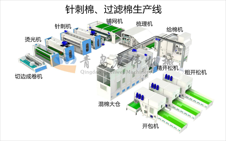 開包機(jī)-開松機(jī)-振動給棉機(jī)-梳理機(jī)-鋪網(wǎng)機(jī)-針刺機(jī)-切邊成卷機(jī)