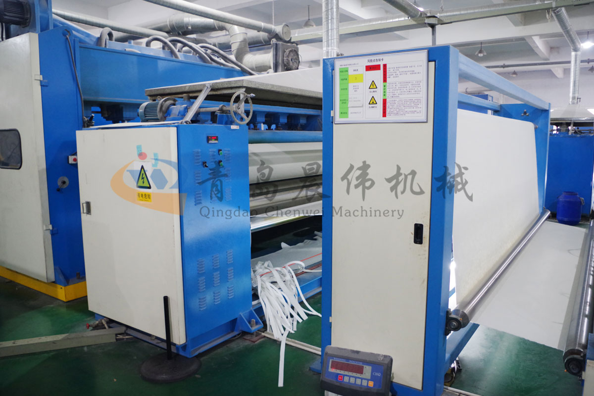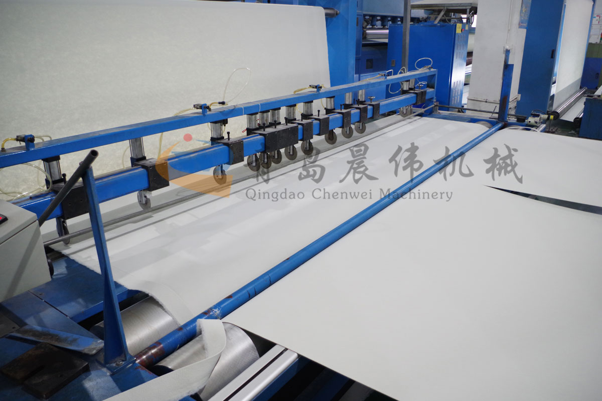 5. CWPW-鋪網(wǎng)機(jī):用于將梳理纖網(wǎng)通過移動小車交叉折疊為所需幅寬和定量的多層纖網(wǎng),以供后道工序使用。鋪網(wǎng)輥采用特殊結(jié)構(gòu),加裝壓網(wǎng)輥和導(dǎo)流板,不飄網(wǎng)不起皺,五只大功率電機(jī)精確控制各部件的運動,電動輸出簾高度調(diào)節(jié)裝置
